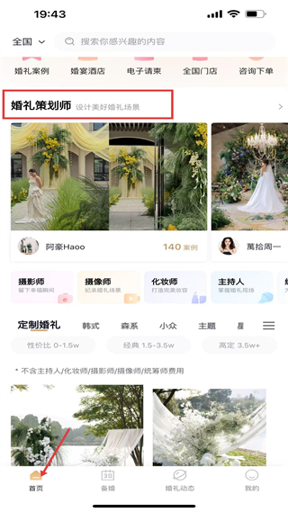 1、首頁設婚禮案例、婚宴酒店等分類,展示婚禮策劃師及定制婚禮類型,是一站式婚禮服務的綜合選擇入口。