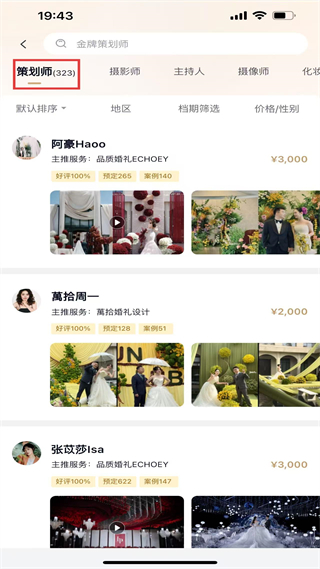 2、策劃師板塊展示多位婚禮策劃師,標注服務價格、好評率及案例數,支持按地區、檔期篩選,便于精準匹配合適策劃師。