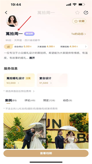 3、策劃師詳情頁呈現個人信息、服務項目及案例,顯示綜合評分,支持查看檔期與收藏,全面了解策劃師服務能力。