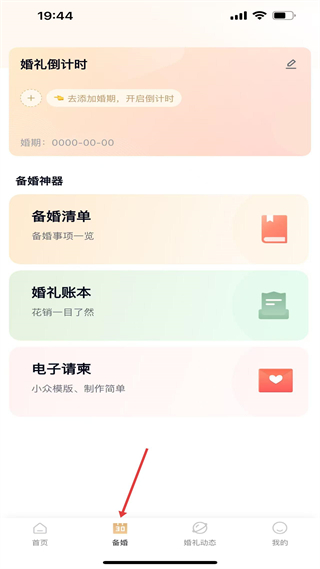 4、備婚頁面含婚禮倒計時、備婚清單等實用工具,提供婚禮賬本、電子請柬功能,高效統籌備婚相關事務。
