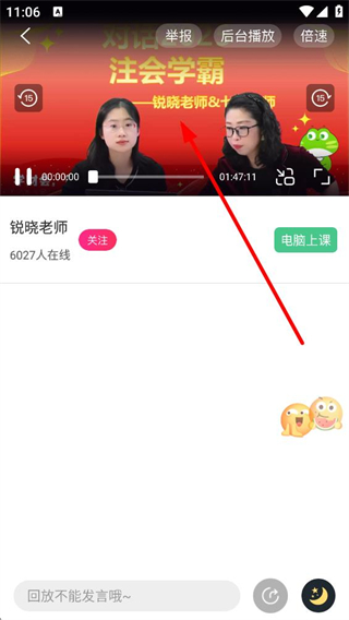 3、進入課程回放界面,可觀看課程視頻,使用倍速、后臺播放等功能,還能關注授課老師,查看在線人數等課程相關信息。