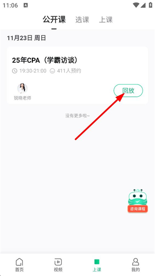 2、點擊公開課進入對應頁面,能查看已安排的課程列表,選擇課程后點擊回放,可觀看該課程的錄播內容,回顧學習要點。