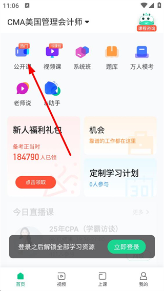 1、進入應用首頁可使用公開課、視頻課等學習功能,領取新人福利禮包,查看今日直播課,登錄后可解鎖全部學習資源。