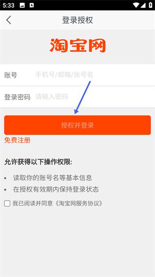 1、淘寶登錄授權頁,需填賬號密碼,勾選協議后授權登錄,可讀取賬號信息并保持登錄狀態,是使用工具的前提。