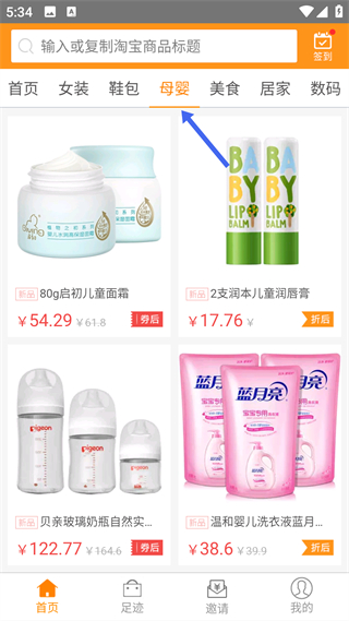3、母嬰分類頁,展示面霜唇膏等母嬰商品,標注券后或折后價,便于用戶查看該品類的優惠好物。