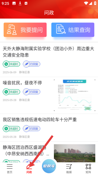 2、政板塊置頂我要提問、結果查詢按鈕,下方陳列交通隱患、噪音擾民等民生訴求,標注未超時、已回復狀態,搭建市民與職能部門的互動橋梁。