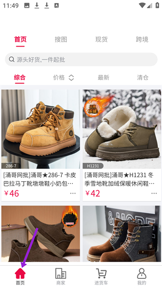 1、首頁,有搜圖、現貨等分類,展示馬丁靴、雪地靴等多款鞋類商品及價格,方便鞋類從業者瀏覽選購批發商品。