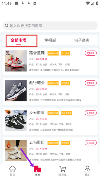 2、商家板塊,有全部市場等分類,展示路譽童鞋、彪行鞋業等多家商家信息,含產品數量、拿貨地址,便于從業者對接鞋類商家。