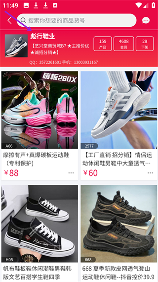 3、彪行鞋業詳情頁,展示碳板運動鞋、情侶休閑鞋等多款產品及價格,為從業者提供該商家鞋類批發選擇。