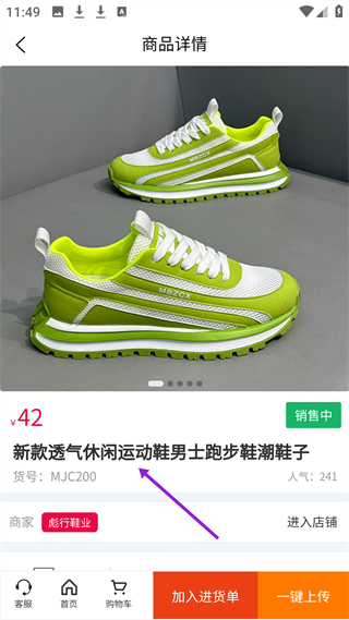4、休閑運動鞋詳情頁,展示鞋子外觀、價格、貨號等信息,商家為彪行鞋業,提供加入進貨單功能,方便從業者批發該款鞋子。