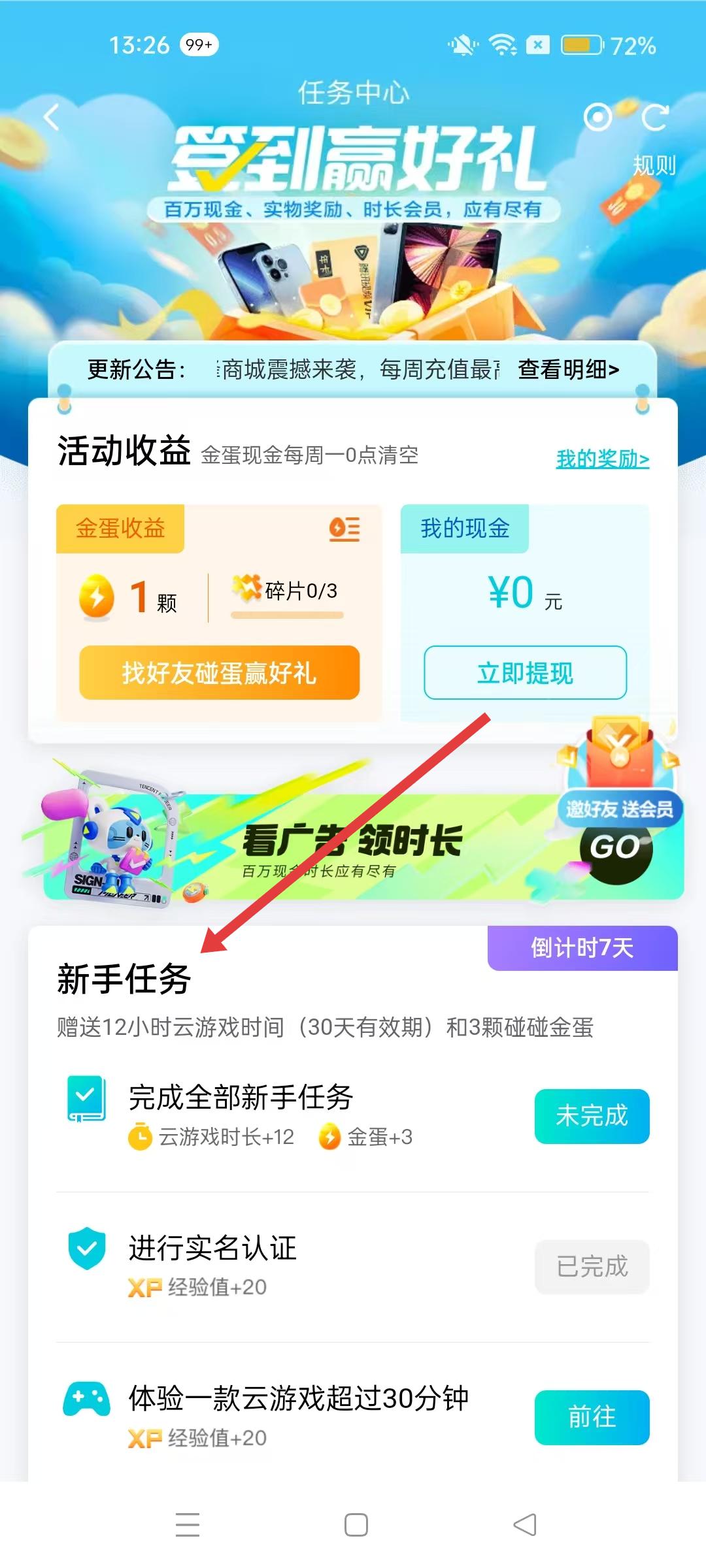 2、進入任務中心,可看到簽到贏好禮等活動,還有新手任務,完成可獲得云游戲時長和金蛋等獎勵,助力游戲體驗。