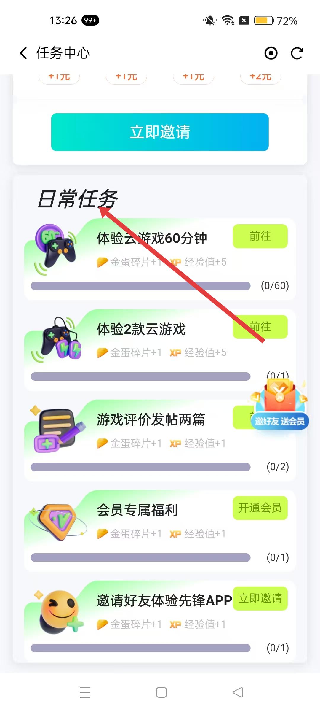 4、任務中心,可查看日常任務,如體驗云游戲、游戲評價發帖等,完成可獲得金蛋碎片和經驗值,提升騰訊先鋒的等級。