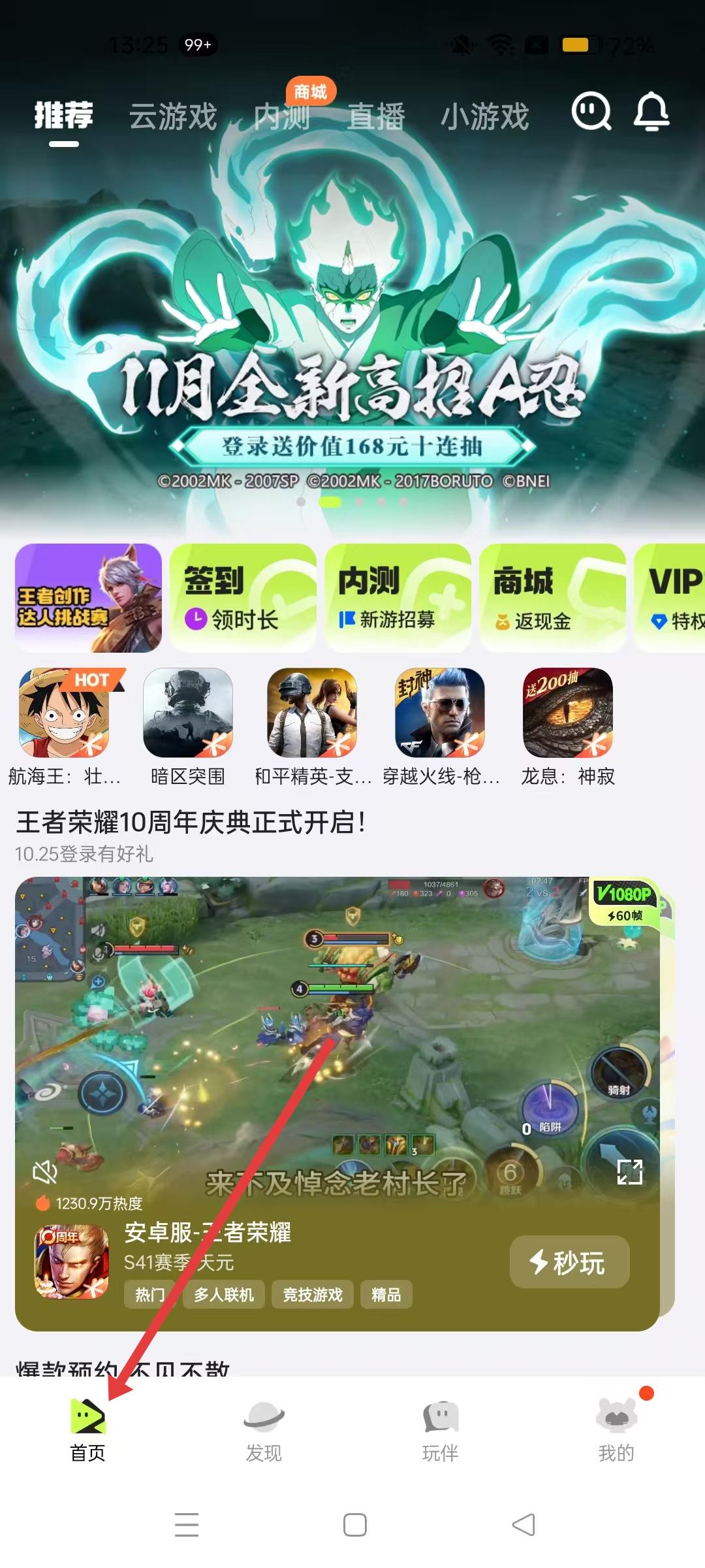 1、進入騰訊先鋒首頁,可瀏覽11月全新高招A忍等活動,還有航海王、暗區突圍等游戲推薦,點擊秒玩可快速體驗游戲。