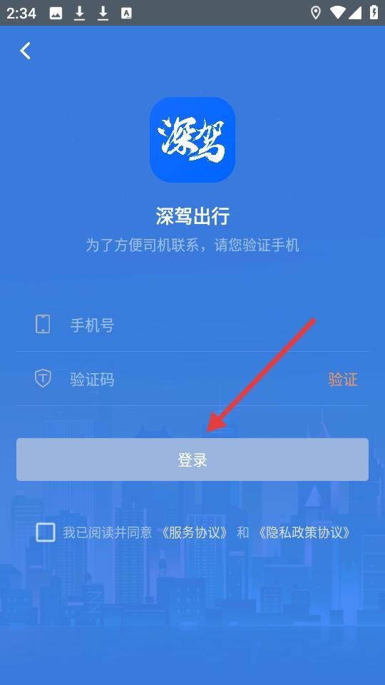 1、點擊登錄界面,因方便司機聯系需驗證手機,填寫手機號與驗證碼,同意協議后可點擊登錄。