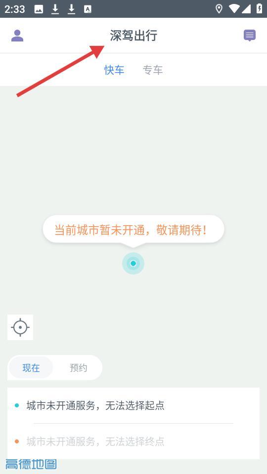 2、點擊深駕出行服務頁,含快車、專車選項,然而當前城市服務未開通,無法選擇行程起點與終點。