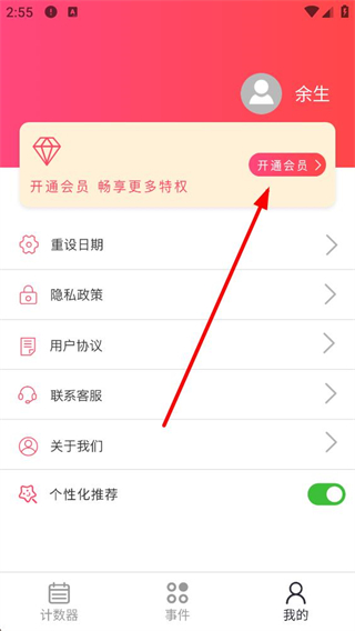 2、點擊底部我的按鈕,可進入個人界面,這里有開通會員選項,還有重設日期隱私政策等功能入口,可進行賬號相關設置與操作。