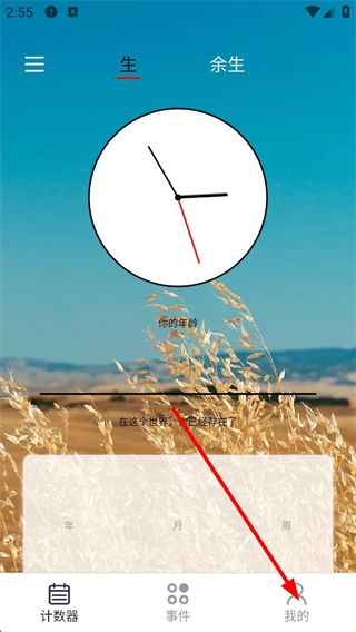 1、進入應用后可看到生與余生切換欄,界面展示時鐘及年齡相關信息,底部有計數器事件我的等功能入口,可開啟時間記錄相關操作。