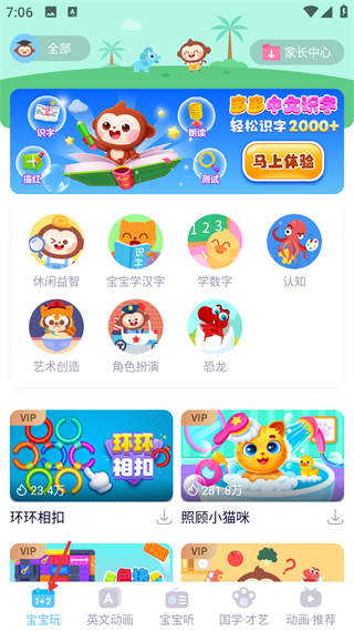 1、寶寶玩頁面提供識字、學數字等啟蒙模塊,含多多中文識字入口,另有VIP互動游戲,是幼兒綜合啟蒙的核心入口。