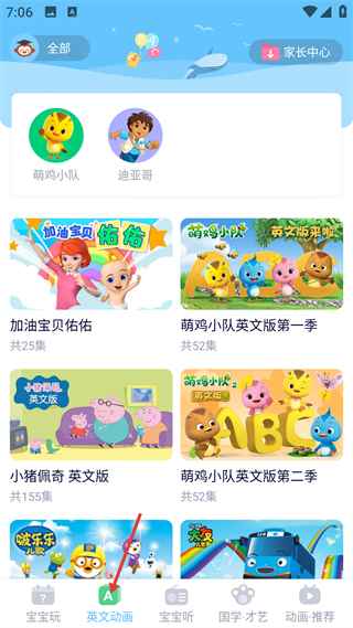 2、點擊英文動畫界面,匯聚萌雞小隊、小豬佩奇英文版等英文動畫,明確集數,助力兒童英語啟蒙。