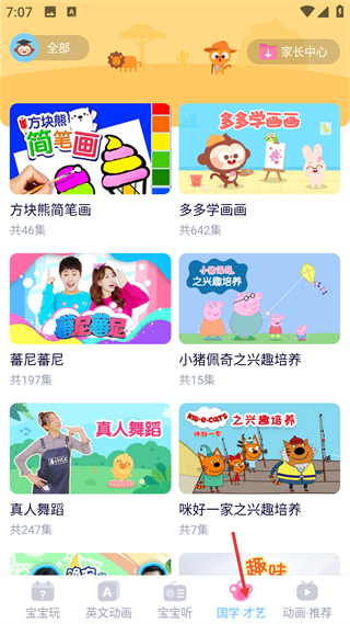 4、國學?才藝頁面呈現簡筆畫等才藝內容,含興趣培養類劇集,輔助幼兒發展藝術與興趣技能。
