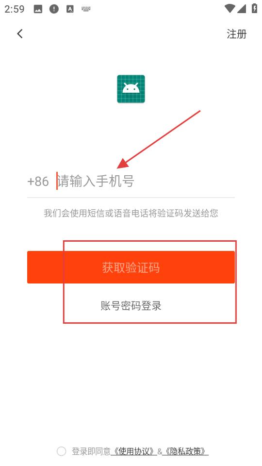 1、打開白菜商家版,在登錄界面輸入手機號,選擇獲取驗證碼或賬號密碼登錄方式,勾選同意協議后完成登錄操作。