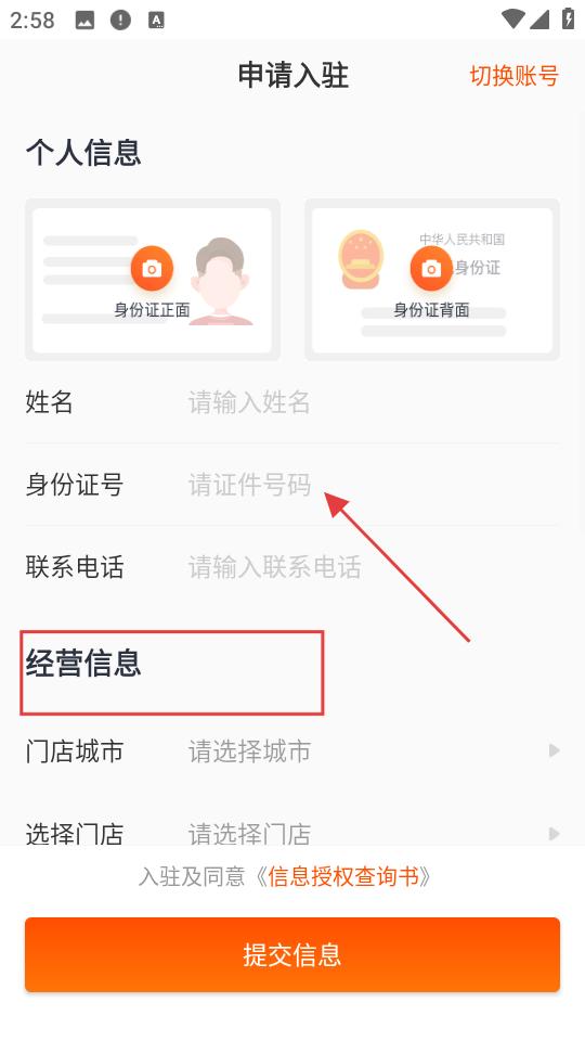 3、進入申請入駐界面,上傳身份證正反面照片,填寫姓名、身份證號等個人信息,補充門店城市、門店選擇等經營信息,提交完成入駐。
