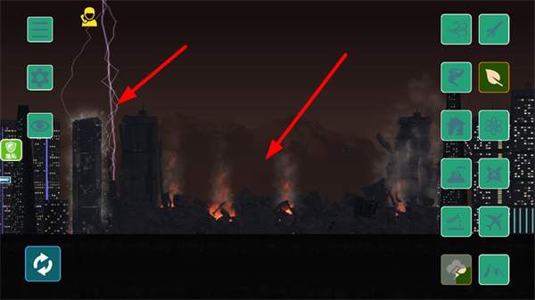 3、切換到夜晚場景后,選擇對應的雷電工具,繼續對城市建筑進行破壞操作,感受夜晚場景下的破壞視覺效果,推進破壞進度。
