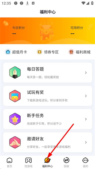 2、點擊福利中心,可進入福利界面,看到今日積分、可用積分板塊,還有超值月卡、領券專區等入口,參與每日答題、試玩有獎等任務可獲取積分。