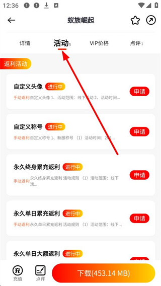 4、點擊游戲詳情頁的活動,可查看返利活動,如自定義頭像、自定義稱號、永久終身累充返利等多項進行中的活動,用戶可申請參與獲取福利。
