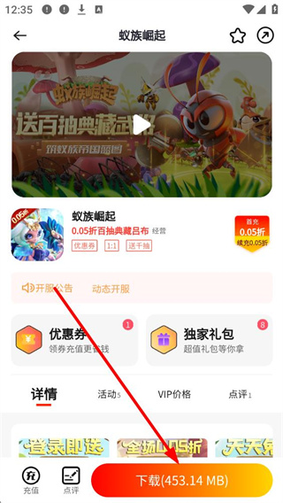 3、游戲詳情頁,可查看蟻族崛起的折扣信息、開服公告等,點擊下載按鈕可下載該游戲,享受優惠。