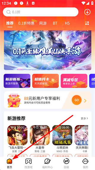 1、進入平臺首頁,可看到特惠等分類,還有新游新服、超值月卡等板塊,新游推薦欄展示多款新游戲,方便用戶了解和選擇游戲。