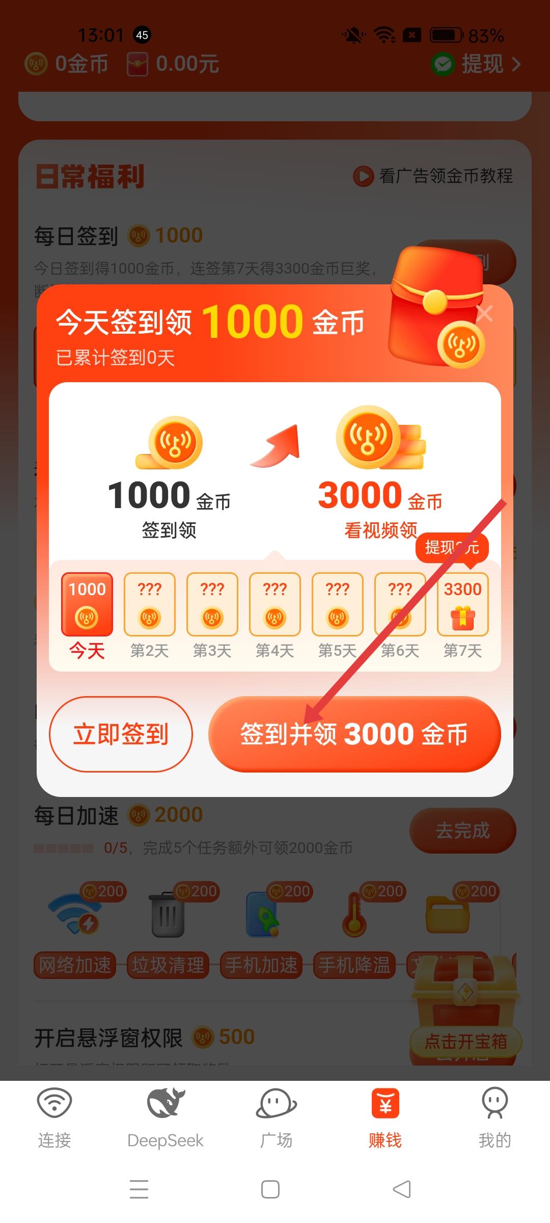 3、簽到頁面,有立即簽到和簽到并領3000金幣等選項,選擇合適的簽到方式,完成簽到操作領取金幣。