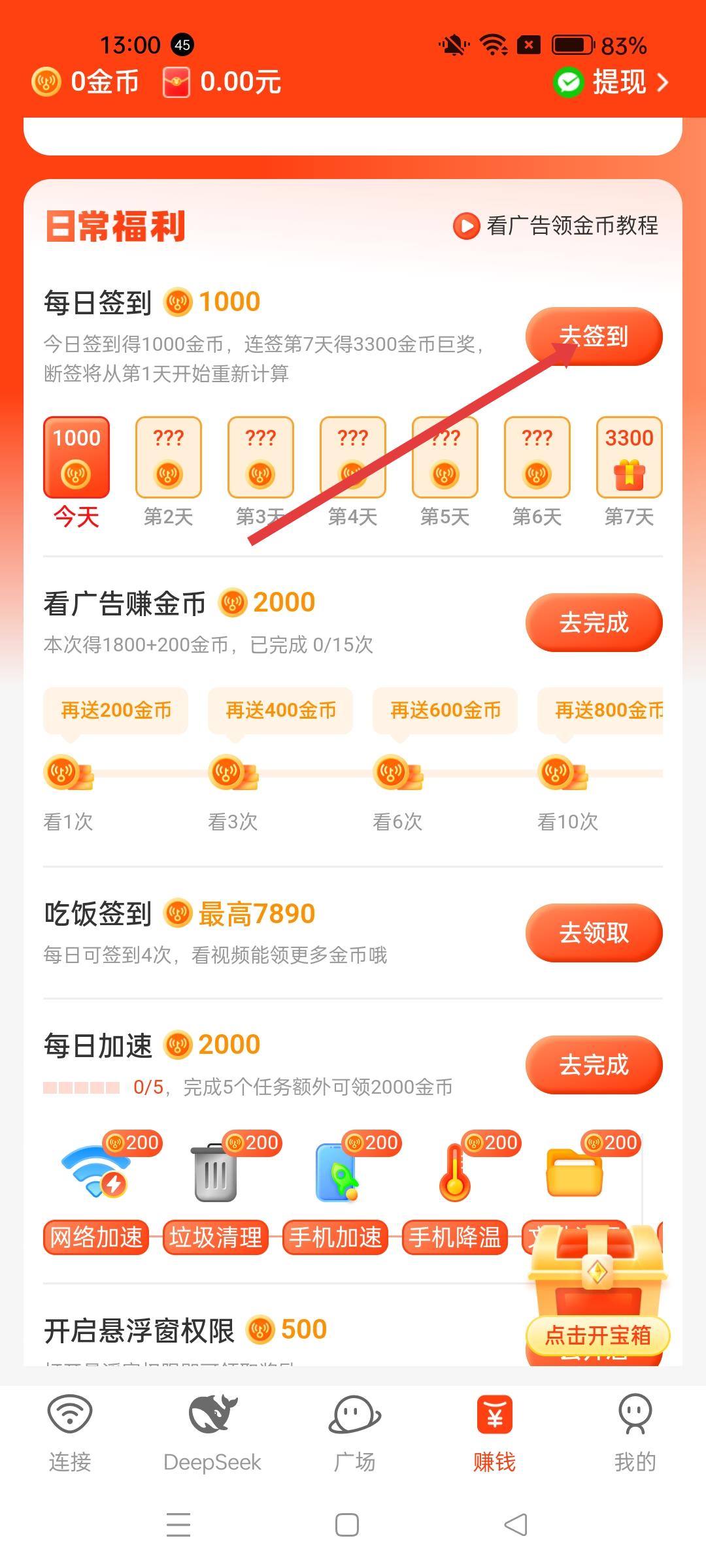 2、進入賺錢界面后,能看到日常福利板塊,其中每日簽到可領金幣,點擊去簽到按鈕,進入簽到頁面。