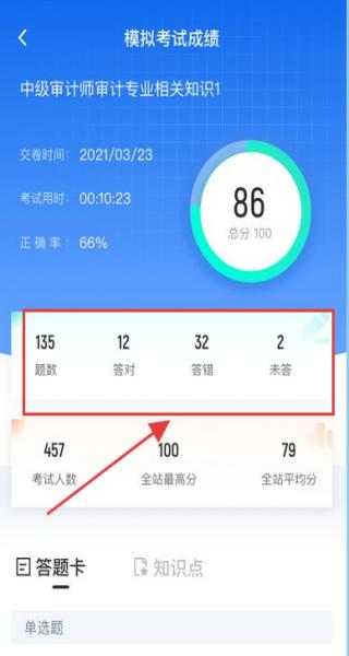 1、展示中級審計師審計專業相關知識1模擬考試結果,有交卷時間,用時,分數86分及正確率66%,還呈現題數、答對答錯未答數量,方便考生了解考試表現。