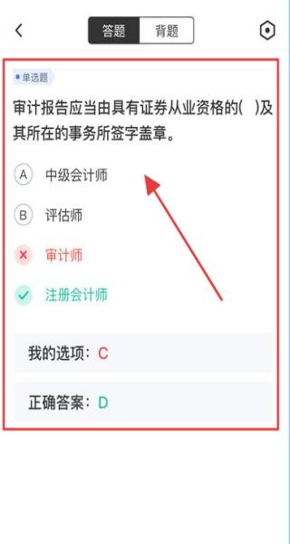 2、題目練習清晰明了,單選題展示題目審計報告應當由具有從業資格及其所在的事務所簽字蓋章,列出選項,標注考生所選及正確答案,助考生明確答題正誤。
