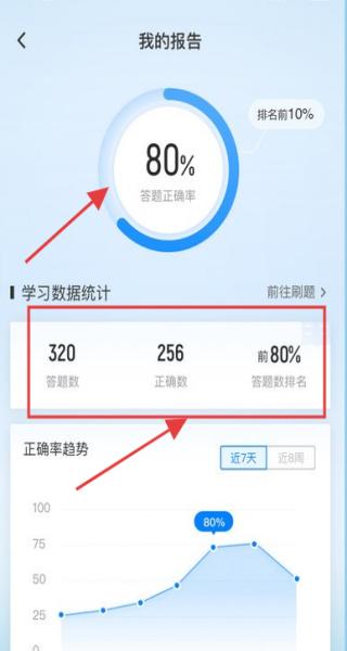 3、呈現答題正確率80%及排名前10%,統計答題數、正確數和排名情況,還有正確率趨勢圖,為考生提供學習數據參考,助力制定學習計劃。