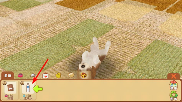 1、點擊左下角菜單按鈕打開物品菜單,選擇純凈水道具,使用后讓小狗飲用,滿足小狗的飲水需求,推進互動流程。