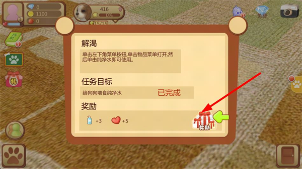 3、完成給小狗喂食純凈水的任務后,界面顯示任務已完成,點擊獎勵按鈕,獲取對應的道具和愛心獎勵,積累游戲資源。
