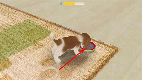 2、使用純凈水后,小狗會主動去碗邊飲水,完成飲水動作,這一操作能提升小狗的狀態,助力后續的游戲互動。