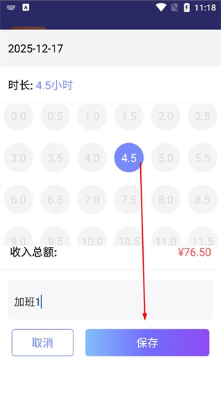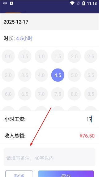 3、在備注輸入框填寫當日工作的相關說明,確認工時、收入及備注信息無誤后,點擊保存按鈕完成記錄。