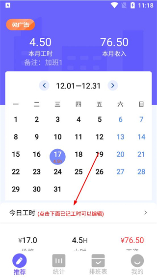 4、保存后返回推薦頁面,可在頁面中查看當日的工時、收入及備注內容,也能繼續記錄其他日期的工時。