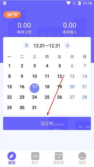 1、打開記工本軟件進入推薦頁面,在日歷中選定目標日期,點擊頁面中的記工時按鈕,進入工時記錄頁面。