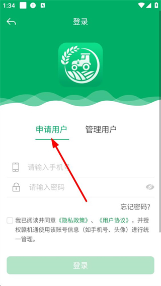 3、登錄時可選擇申請用戶身份,輸入手機號和密碼,勾選協議后登錄,也可選擇管理用戶身份,若忘記密碼可進行找回操作。