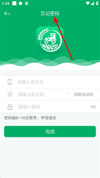 4、忘記密碼時,輸入手機號、獲取并輸入驗證碼,設置數字和字母組合的新密碼,點擊完成即可重置密碼,重新登錄贛機通APP。
