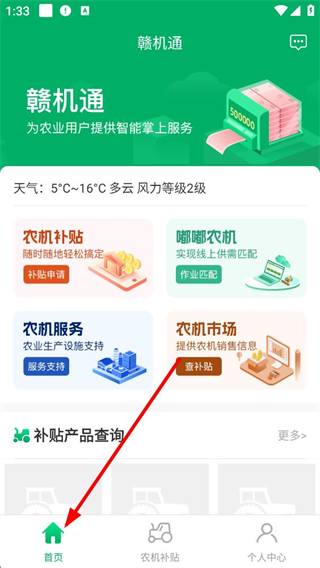 1、首頁為農業用戶提供農機補貼、嘟嘟農機、農機服務、農機市場等智能掌上服務,還有補貼產品查詢功能,助力農業用戶便捷辦理農機相關業務。