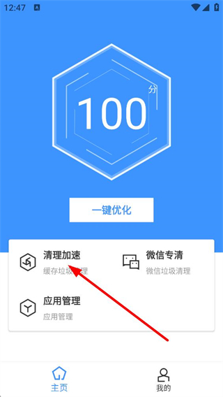 1、進入優化清理助手首頁,可見分數顯示與一鍵優化按鈕,還有清理加速等功能選項,點擊清理加速,進入對應清理操作界面。