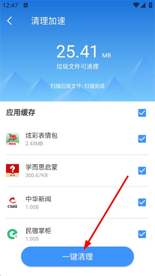 2、進入清理加速界面,顯示可清理垃圾文件,還有應用緩存列表,點擊一鍵清理按鈕,開始執行垃圾文件清理操作。