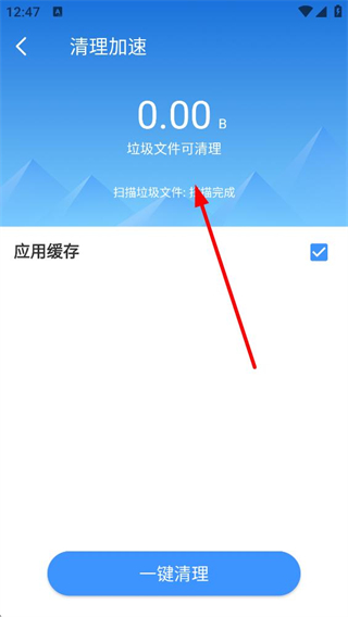 3、清理完成后,界面顯示垃圾文件可清理為0B,掃描狀態為掃描完成,至此完成本次清理加速的全部流程。