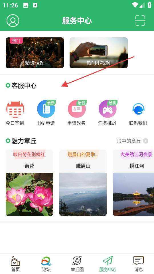 2、切換至服務中心,進入客服中心,使用今日簽到刪帖申請等功能,也可瀏覽魅力章丘相關內容。