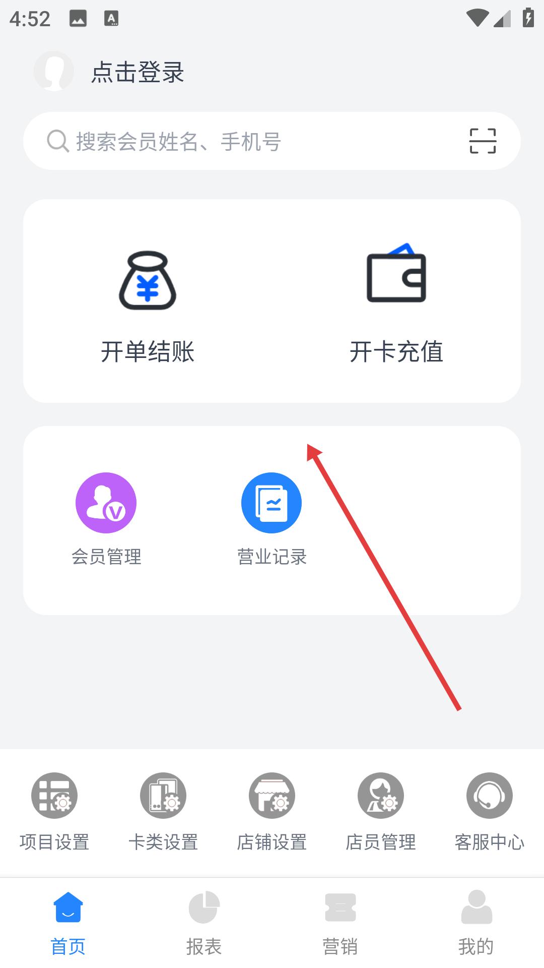 2、進入APP首頁,這里有開單結賬、開卡充值等眾多功能入口,點擊點擊登錄按鈕,即可進入登錄流程。
